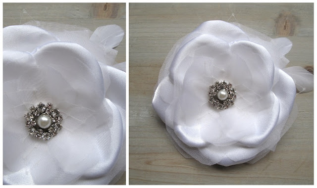 | White or ivory satin and silk organza flower with rhinestones and feathers |