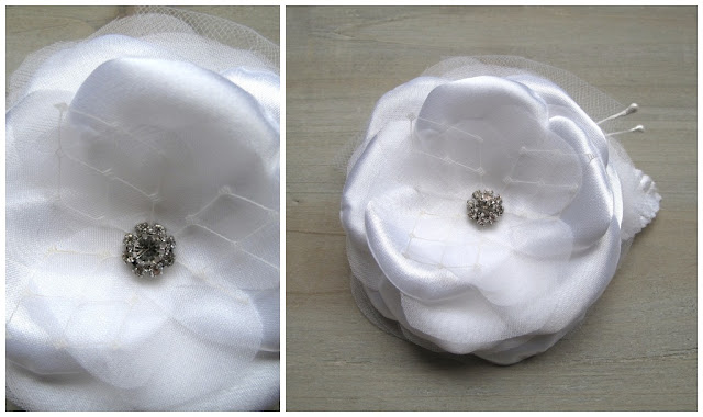 | White or ivory satin and organza flower with tulle, stamens and rhinestone |