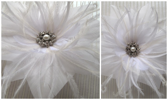 | White and cream feather flower with rhinestone and pearl centre |