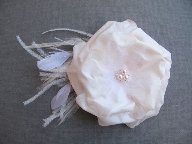 Camille and Zoe are some of the newest pieces in the shop. Camille is too sweet for words... it's small, simple and oh so pretty. The silk organza and silky satin flower itself is 2.5" wide with some extra pretty tulle, feathers, velvet millinery leaves and rhinestone accents extending another 1.5"-2.5". It's perfect for a bride looking for something subtle and beautiful.