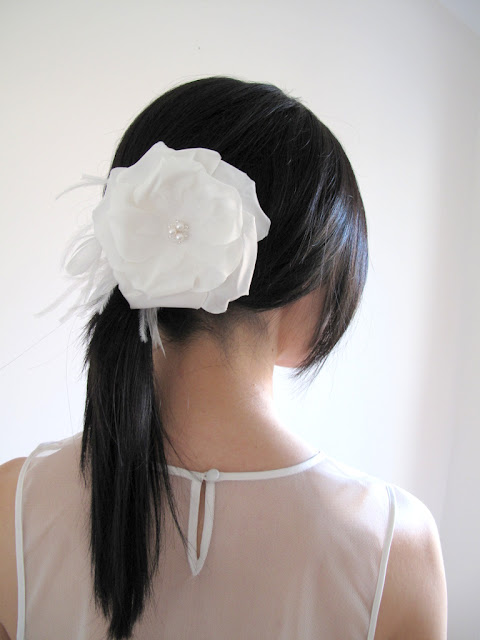 These blooms have tulle accents and are adorned with Swarovski pearls and crystals for a simple and elegant finish. The sizes pictured in the last photo below are 2", 3" and 4.5" although I'm sure if I had a free moment I could make them a little bigger. I do love big blossoms after all! They can also be accented with a spray of beautiful feathers and/or larger tulle details. Please contact me if you'd like to discuss options.